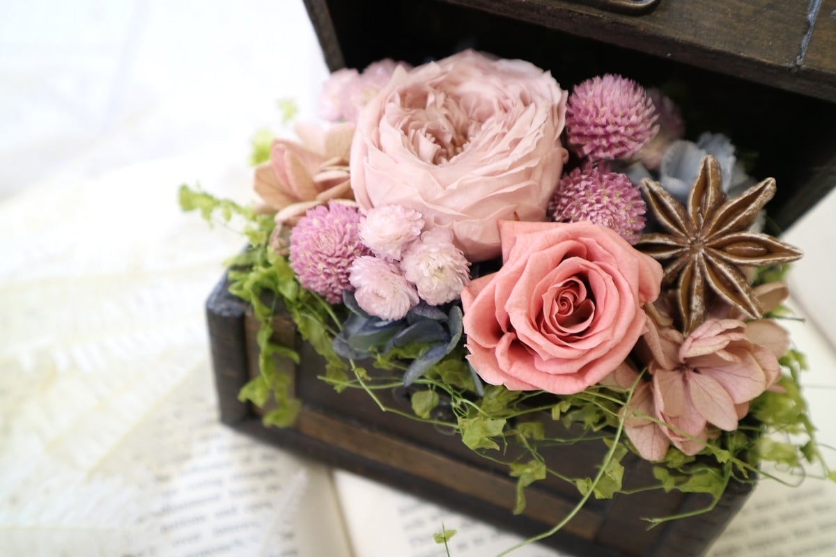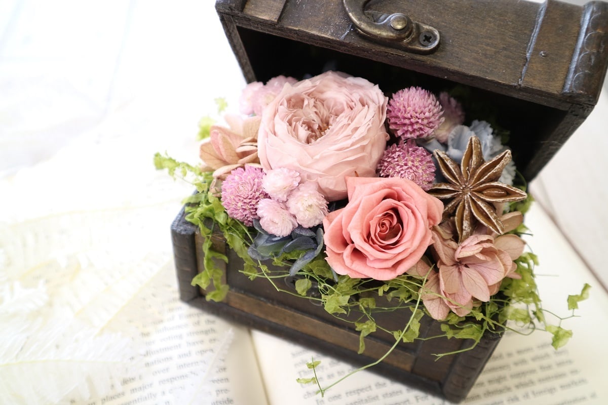 ・プリザーブドフラワー:バラ、アジサイ、カーネーションなど