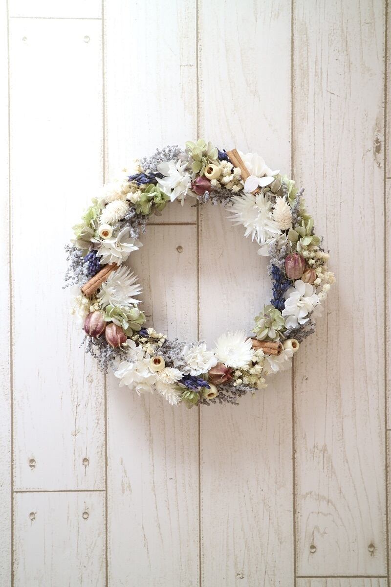 [wreath] ホワイト&スモーキーカラーのボタニカルリース・Mサイズ